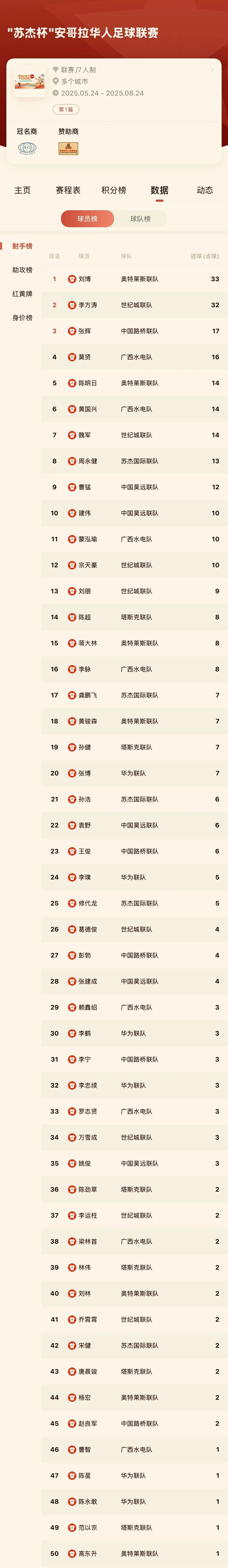经过两个多月13轮比赛的激烈角逐,首届苏杰杯安哥拉华人足球联赛,即将于8月24日傍晚画上圆满的句号,8月24日下午将进行最后两场比赛,华为联队对阵塔斯克联队,世纪城联队对阵奥特莱斯联队。
