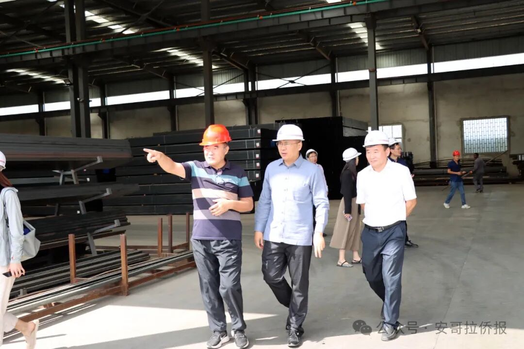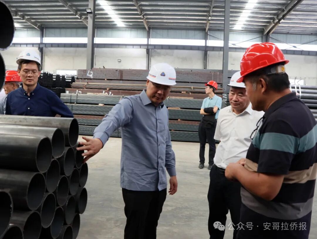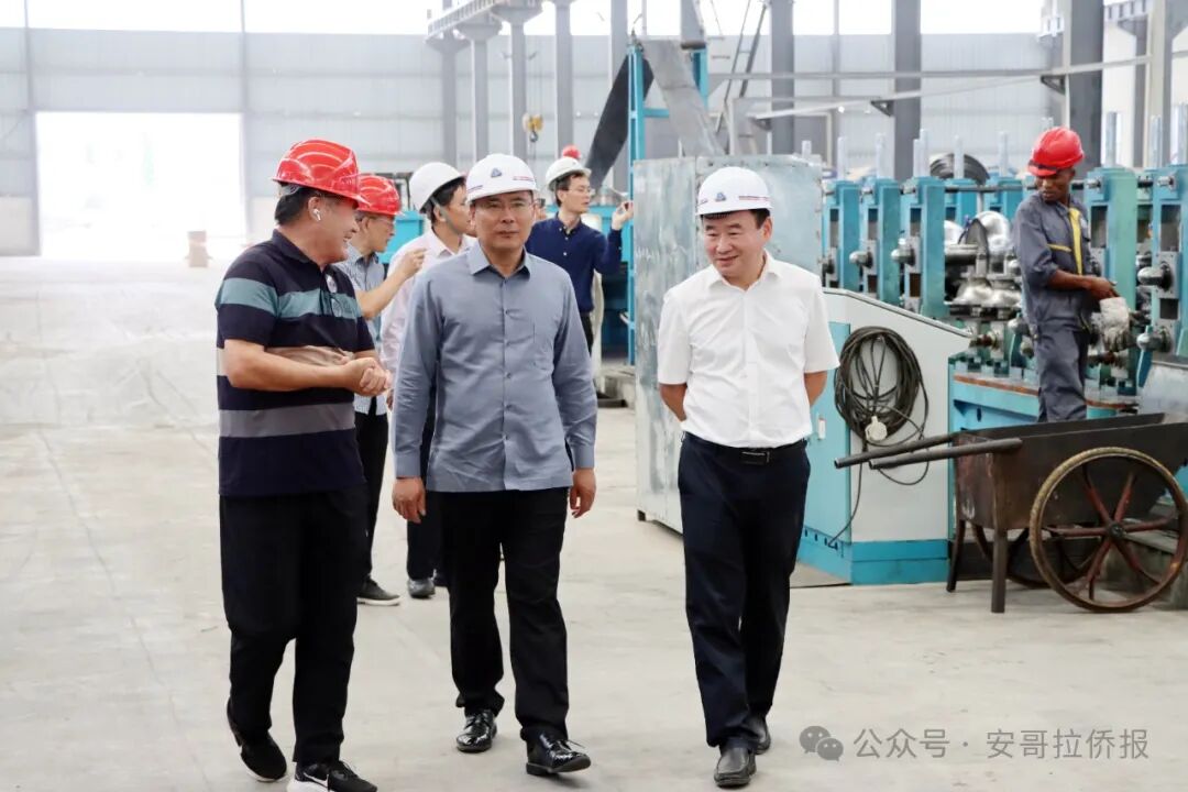 王林元陪同张斌大使一行,参观了镀锌厂、方管厂、钢管、铁板、网片、铁丝、轻钢龙骨、高速围栏板、路灯杆等生产车间,从各类钢材制品的产品质量、市场占有率情况,到环保设施和措施的投入,以及安全生产的严格管理,张斌大使认真听取王林元对工厂各单元的介绍。